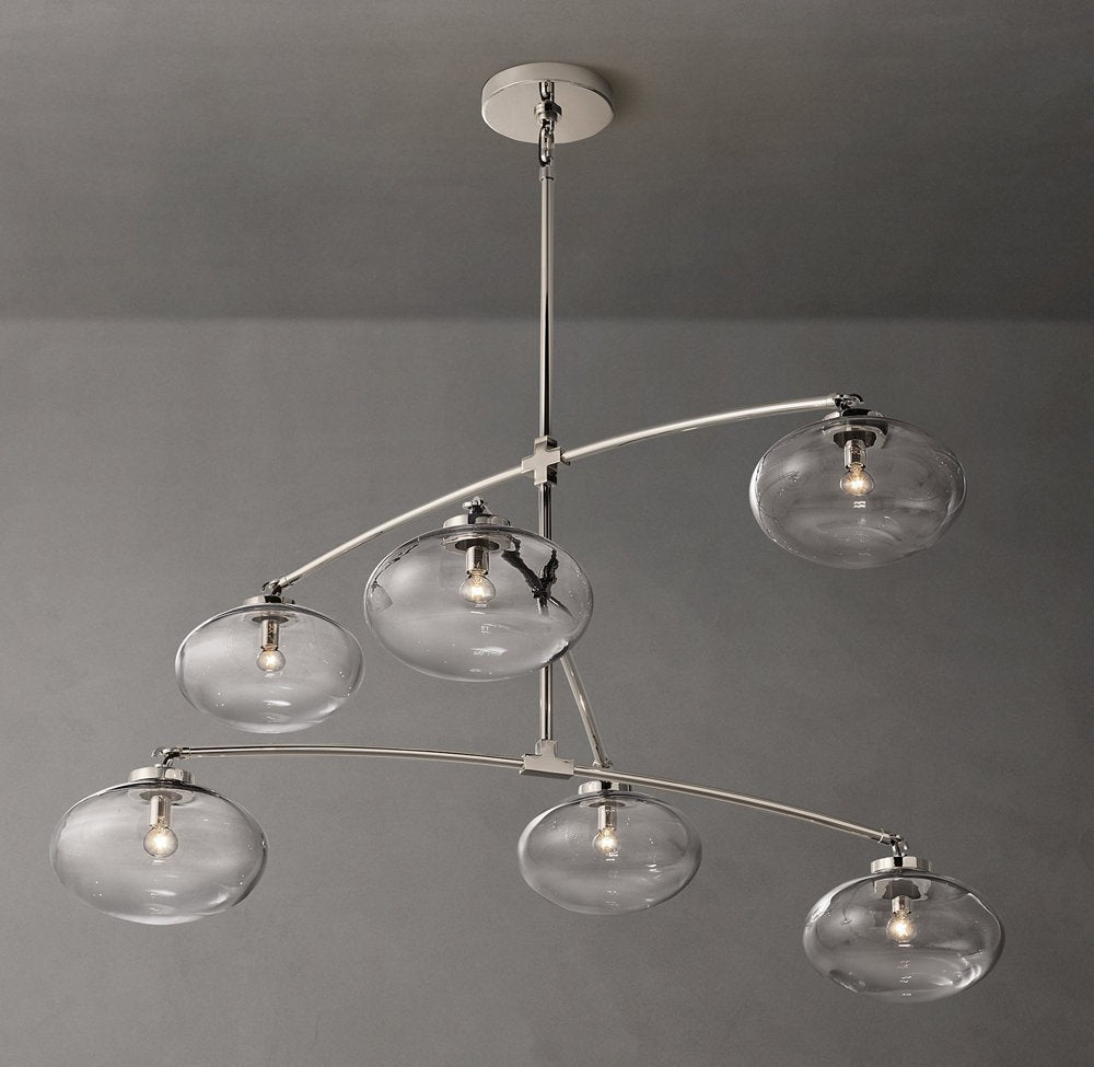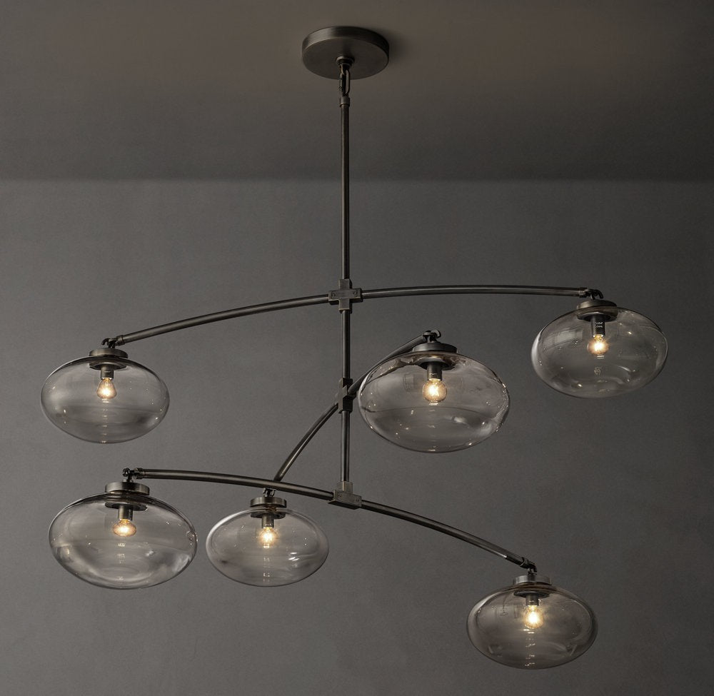 The Cabrette Mobile Chandelier introduces movement and balance through a sculptural steel frame fitted with hand-blown clear glass globes. Its airy composition delivers warm, diffused light with modern artisan character.