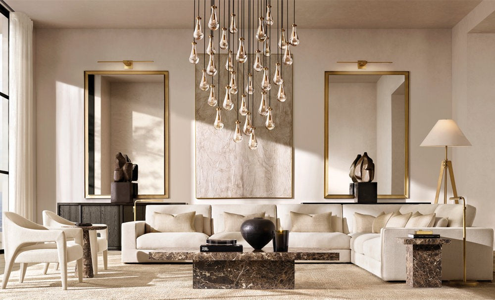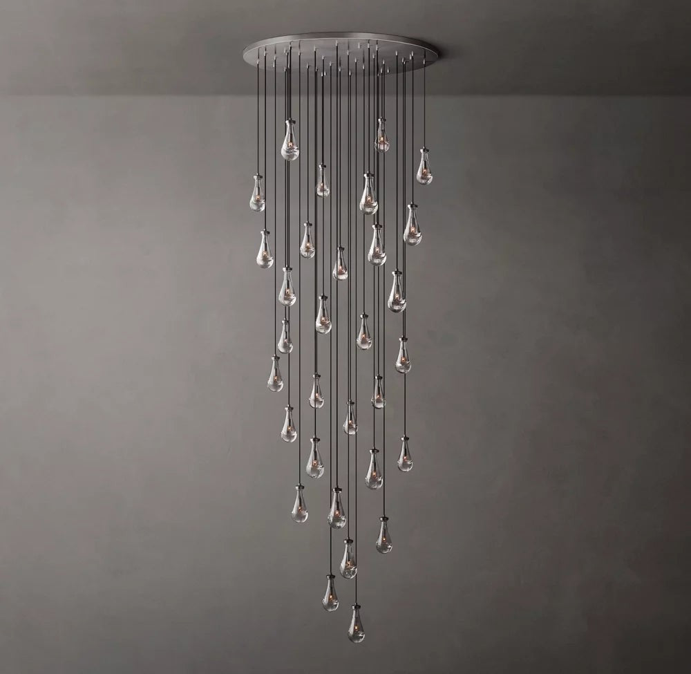 The Rain Round Chandelier creates a dramatic visual cascade through individually hand-blown solid glass raindrops suspended from refined brass fittings. Each sculptural element reflects artisanal craftsmanship, producing a luminous centerpiece for statement interiors.